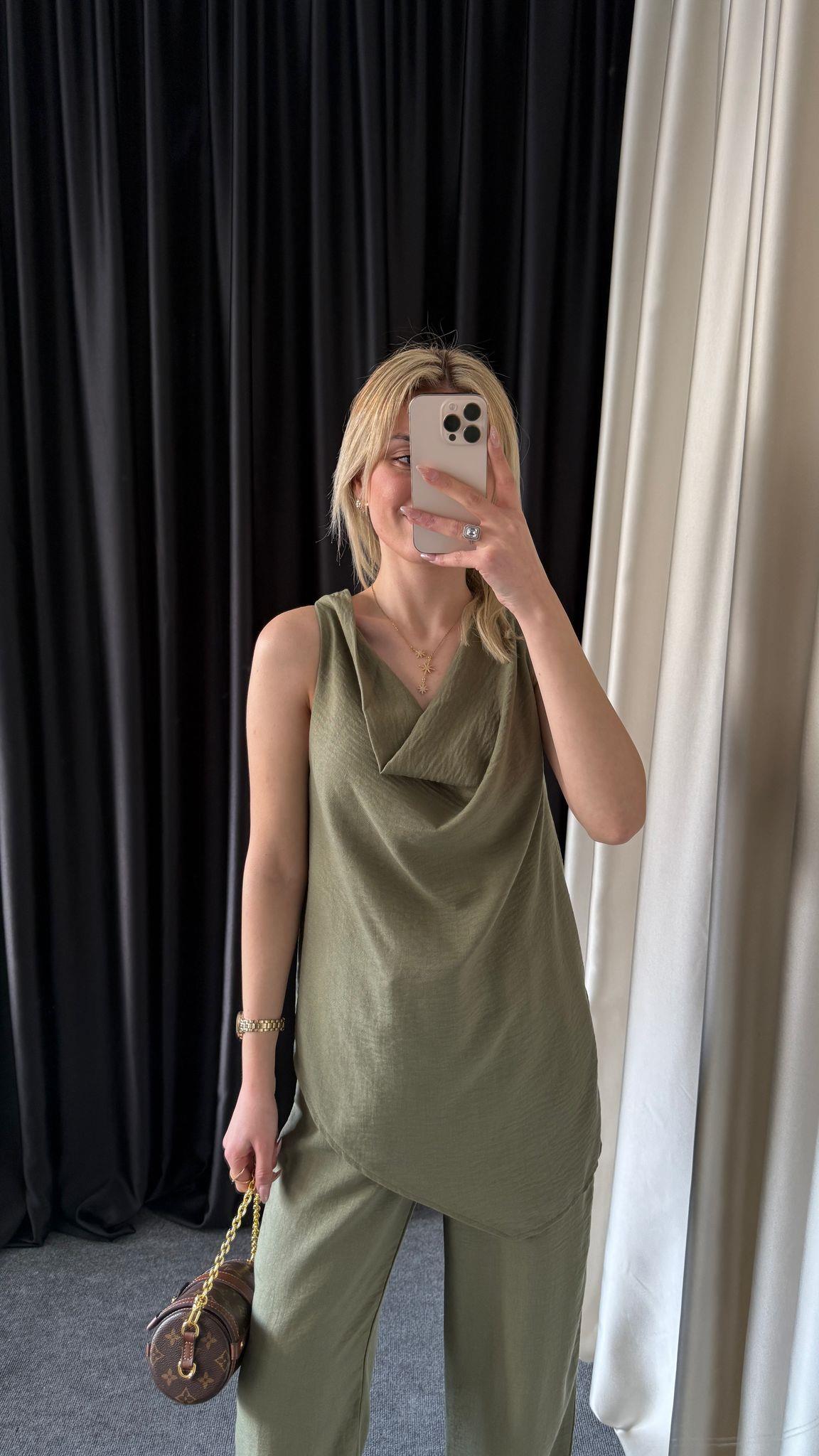 DEGAJE YAKA ASİMETRİK YEŞİL BLUZ